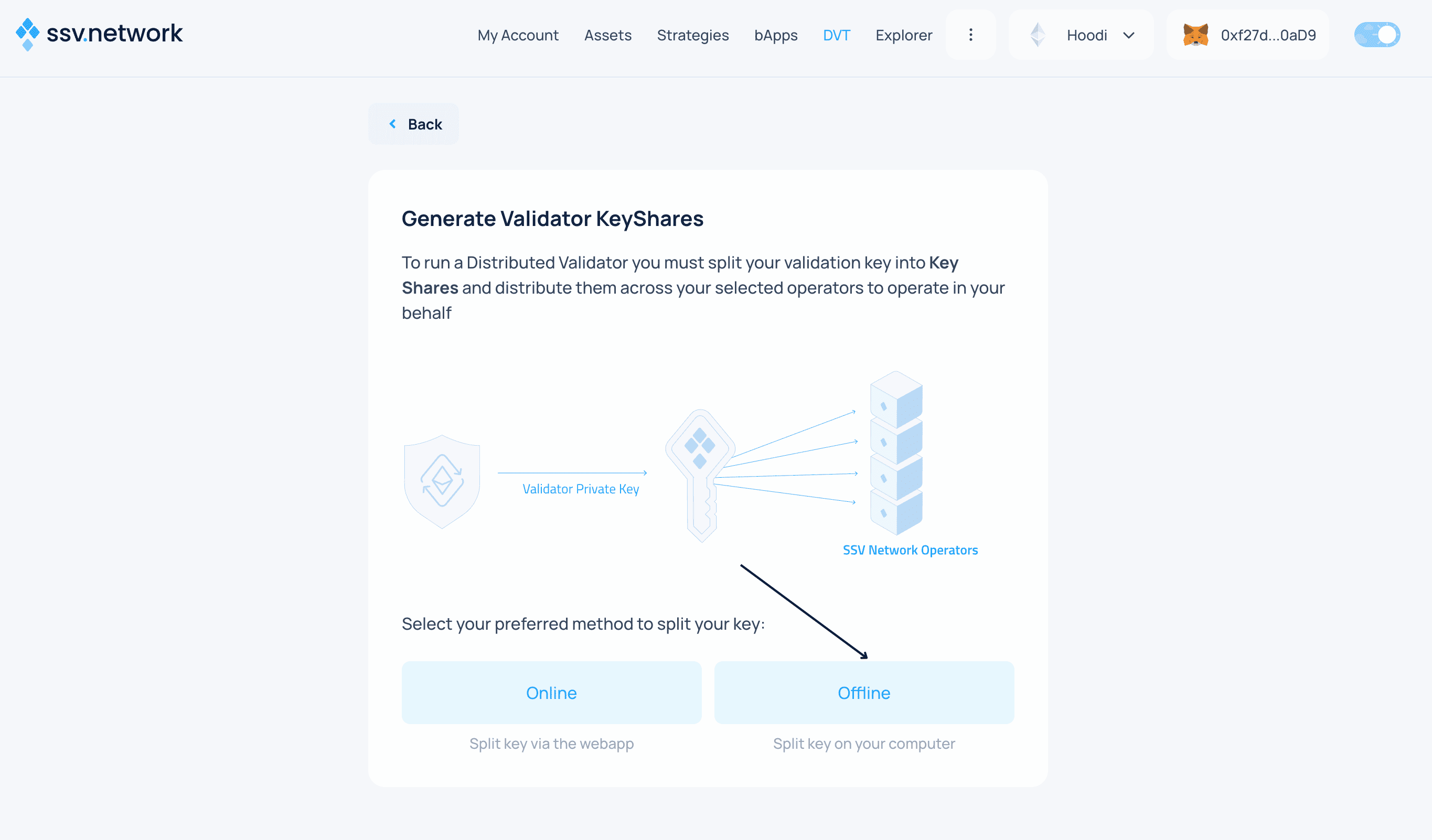 This section walks you through distributing your StakeWise validator keys to a cluster of SSV operators using the SSV webapp. The process involves selecting operators, generating encrypted keyshares offline using the CLI, and completing registration through the webapp.