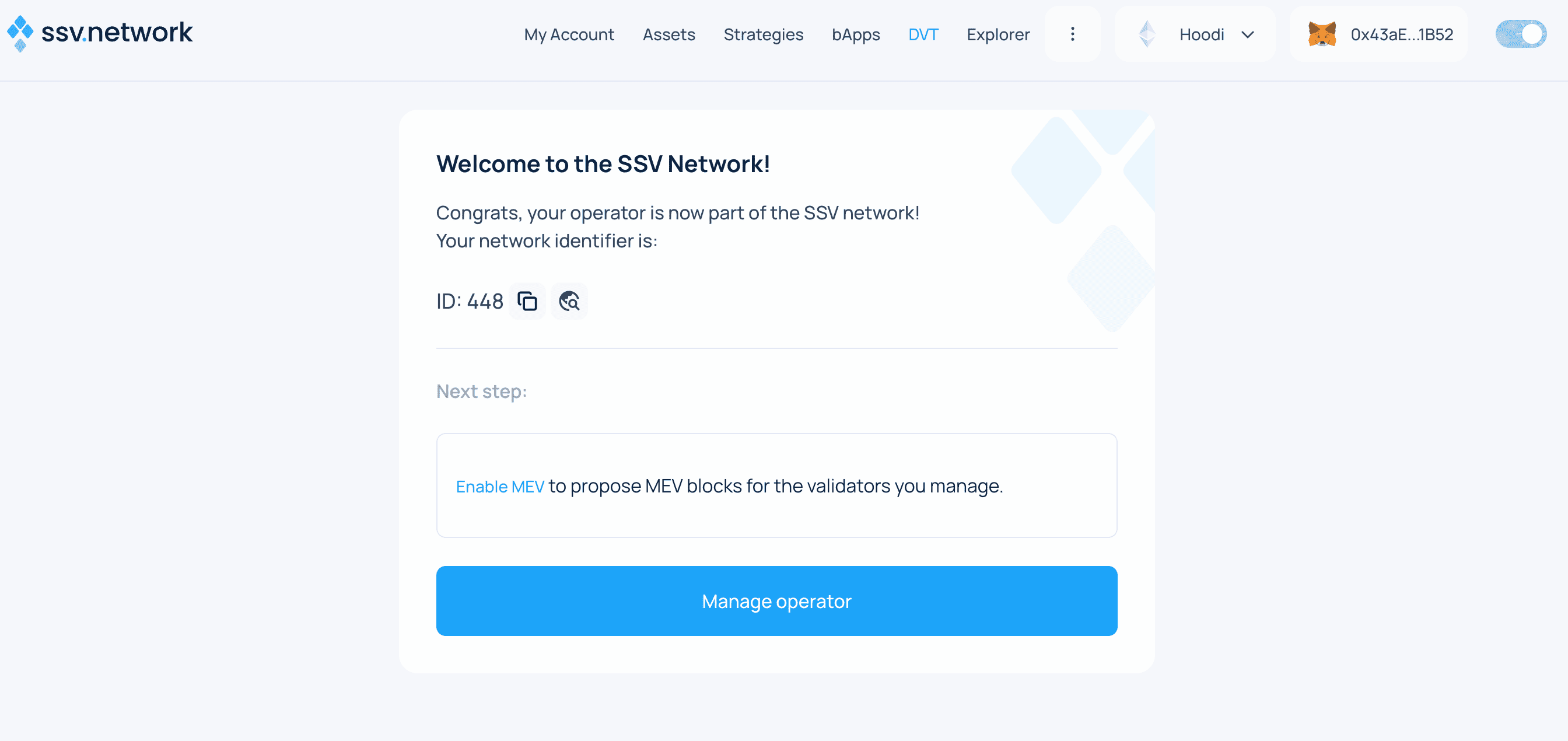 - Congratulations 🥳. Your Operator is successfully registered, and stakers can now choose it to operate their validators.